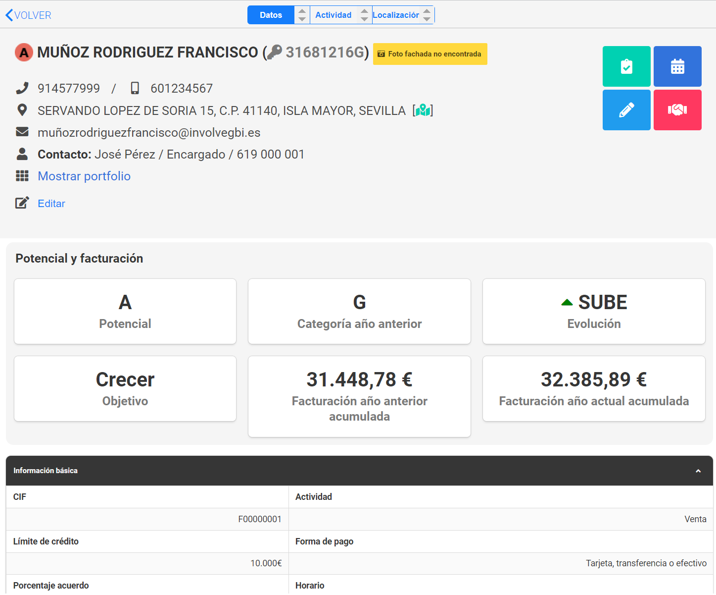 La visión integral de la cartera de clientes, se completa accediendo al detalle de los datos de un cliente concreto: datos de contacto, segmentación, ventas (split por marcas y/o productos, evolución, potencial), actividades (como visitas, llamadas, emails, acuerdos comerciales)